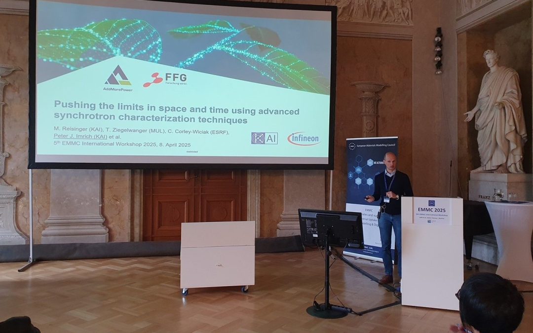 Peter Imrich, head of the KAI Materials Science & Simulation team at KAI presented an invited talk at the 5th EMMC International Workshop 2025, April 8-10 in Vienna. The presentation focused on advanced characterization techniques using Synchrotron X-ray radiation, achieving submicron lateral resolution and nanosecond time resolution for a better understanding of microelectronics materials and devices. These results are an outcome from the Horizon Europe project AddMorePower and the national Austrian projects MULTICHARM and ARCADE. The EMMC Workshop was a great opportunity to network with the Horizon Europe sister projects AID4Greenest, CoBRAIN, MatCHMaker and Knowskite-X and D-STANDART which also deal with materials characterization, simulation and FAIR data storage.